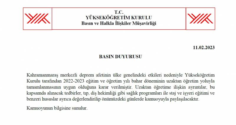 Kahramanmaraş merkezli deprem afetinin ülke genelindeki etkileri nedeniyle Yükseköğretim Kurulu tarafından 2022-2023 eğitim ve öğretim yılı bahar döneminin uzaktan öğretim yoluyla tamamlanmasının uygun olduğuna karar verilmiştir.