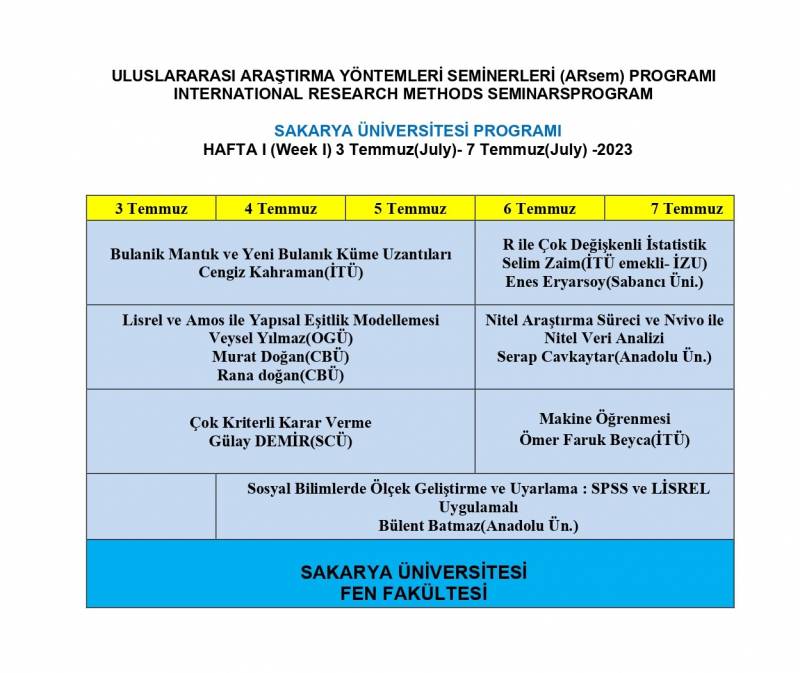 Sakarya Üniversitesi, İstanbul Teknik Üniversitesi ve Anadolu Üniversitesinin birlikte organize ettiği YÜZ YÜZE yapılacak olan Yaz seminerleri 3 Temmuz - 4 Ağustos tarihleri arasında üç üniversitenin kampüslerinde düzenlenecektir. Bu bağlamda, Üniversitemizdeki seminerler 3-7 Temmuz tarihlerinde Fen Fakültesinde düzenlenecektir.