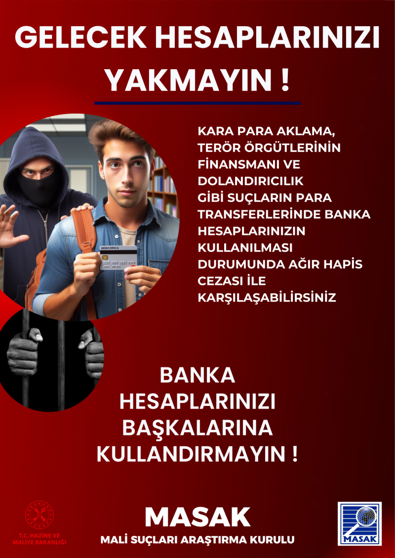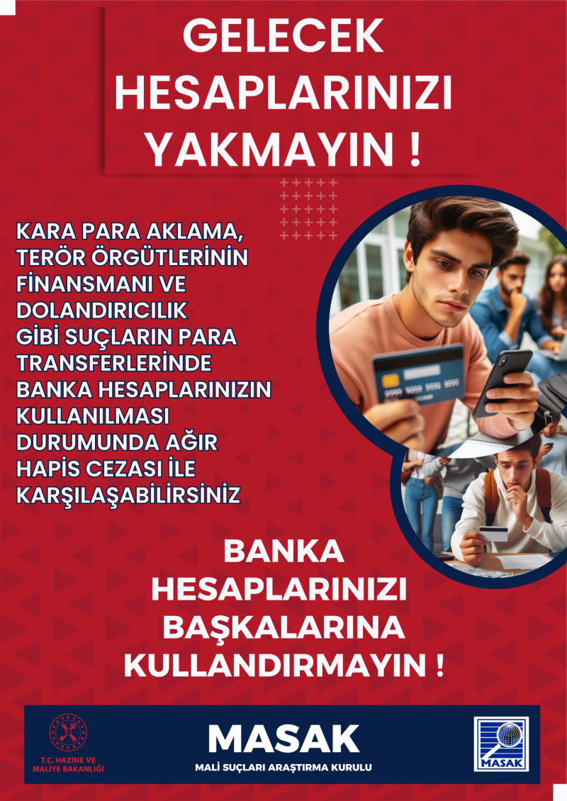 Hazine ve Maliye Bakanlığı Mali Suçları Araştırma Kurulu Başkanlığından gelen yazı ile, 1 sayılı Cumhurbaşkanlığı Kararnamesinin 231.maddesi ile 5549 sayılı Suç Gelirlerinin Aklanmasının Önlenmesi Hakkında Kanun ve 6415 sayılı Terörizmin Finansmanının Önlenmesi Hakkında Kanun kapsamında sürdürülen çalışmalar çerçevesinde son dönemlerde özellikle üniversite öğrencilerinin banka hesaplarını başkalarına kullandırmak suretiyle gelir elde ettiği, kullandırılan bu hesapların suç gelirlerinin aklanması, terörizmin finansmanı, dolandırıcılık gibi ağır hapis cezalarına neden olan suçlarda kullanıldığı bildirilmiş olup bahsi geçen hususta mağduriyetler yaşanmaması maksadıyla üniversite öğrencilerine uyarıda bulunulması istenmiştir.